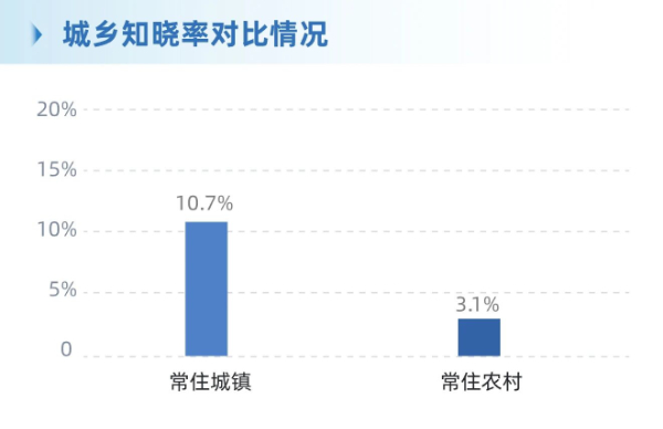 城乡差异:城镇常住群体知晓率(10.7%)高于农村常住群体(3.1%),农村普及存在短板。