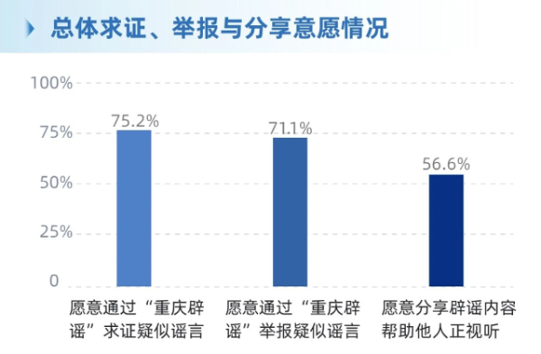 愿意通过“重庆辟谣”求证疑似谣言的占75.2%,愿意通过“重庆辟谣”举报疑似谣言的占71.1%,愿意分享辟谣内容帮助他人正视听的占56.6%。