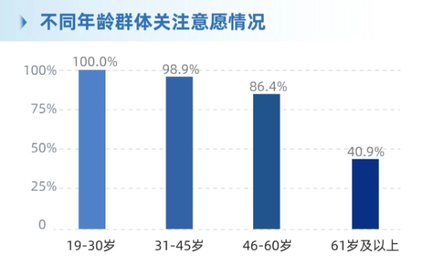 年龄差异:19-30岁关注意愿达100%,31-45岁为98.9%,46-60岁为86.4%,61岁及以上为40.9%。