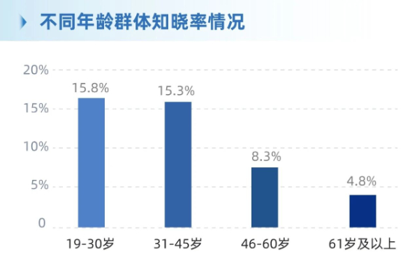 年龄差异:19-30岁群体知晓率最高(15.8%),61岁及以上群体最低(4.8%)。