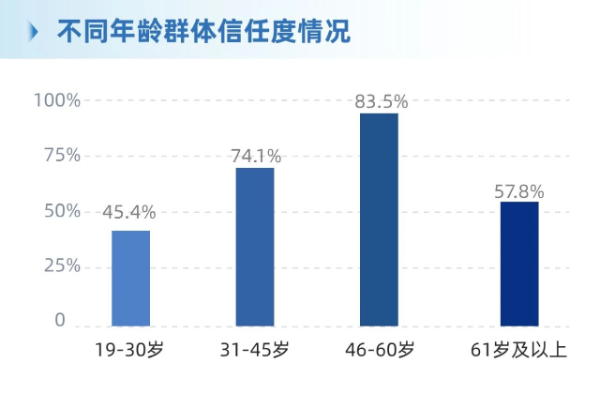年龄差异:46-60岁信任度最高(83.5%),“完全信任”占比46.4%,31-45岁信任度74.1%,61岁及以上信任度57.8%,19-30岁信任度45.4%。