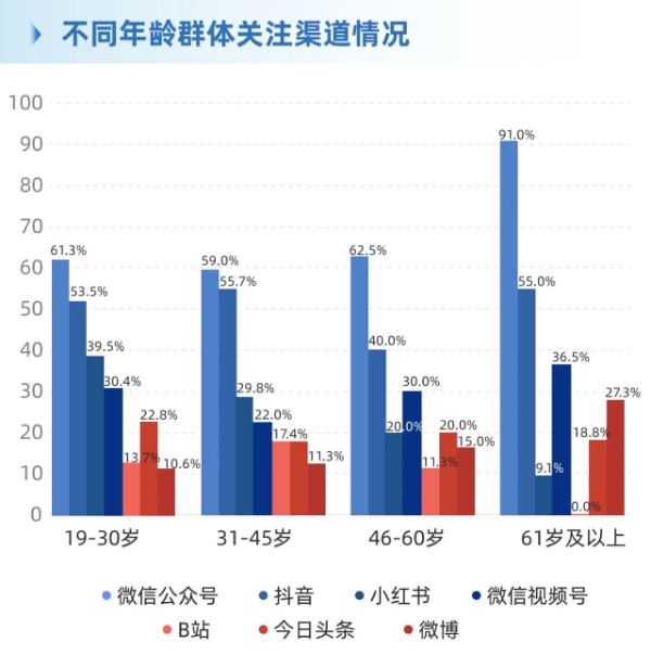 19-30岁:以微信公众号(61.3%)和抖音(53.5%)为主,小红书、微信视频号分别为39.5%、30.4%;