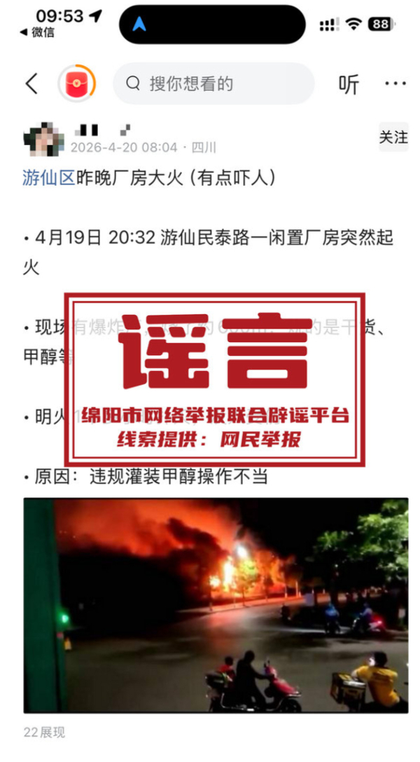 4月20日,有网民在网络平台发布帖文“游仙区昨晚厂房大火(有点吓人)”,称四川省绵阳市游仙区民泰路一闲置厂房突然起火,“燃烧面积约600平方米,燃烧物包含干货、甲醇等”,并配发大火爆燃图片,该帖文引发部分网民关注与讨论。经消防、属地及相关部门核查确认,该消息纯属谣言。