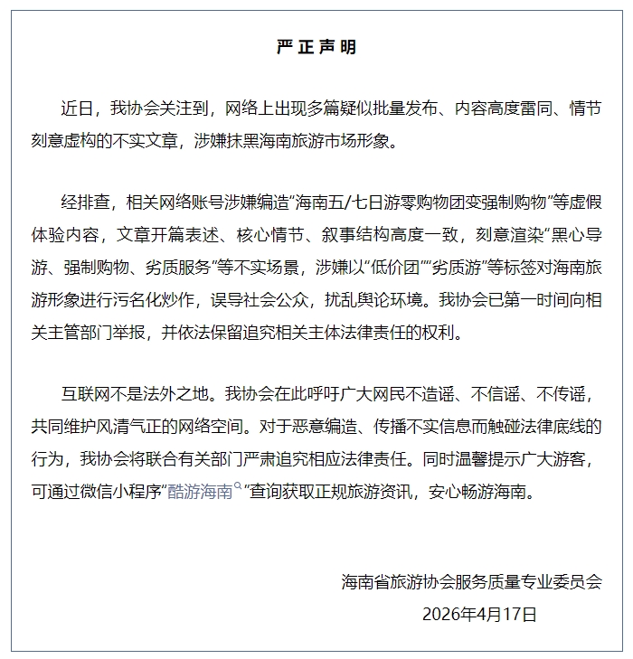 4月17日,海南省旅游协会服务质量专业委员会对外发布严正声明:
